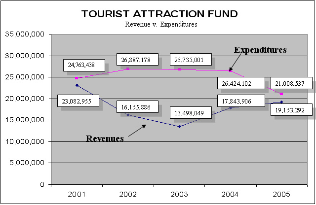 The FY 2005 Tourist Attraction Fund (TAF) audit was conducted by Deloitte & Touche, LLP. Total revenue, primarily derived from hotel occupancy taxes, increased from the previous year for the second year in a row to $19.1 million, up from FY 2004 $17.8 million for a 7.3% increase. This is, however, still short of the five year high of $23 million from FY 2001. See chart below. Expenditures continue to exceed revenues. Expenditures for FY 2005 totaled $21 million, a decline of $5.4 million from FY 2004. Major areas of expenditures were payments of $10.2 million to Guam Visitor’s Bureau for their FY 2005 operations; capital outlay of $3.5 million; and $7.3 million for debt service. The TAF has a net deficit of $2.4 million. The operating fund of the TAF has no cash and now owes $3.9 million to the General Fund. The Capital Projects Fund showed a surplus of $12 million that is restricted mainly for implementing infrastructure improvement projects and paying the cost of bond issuance and letter of credit fees. The Debt Service Fund also had a surplus of $13.8 million restricted in accordance with the bond indenture. |